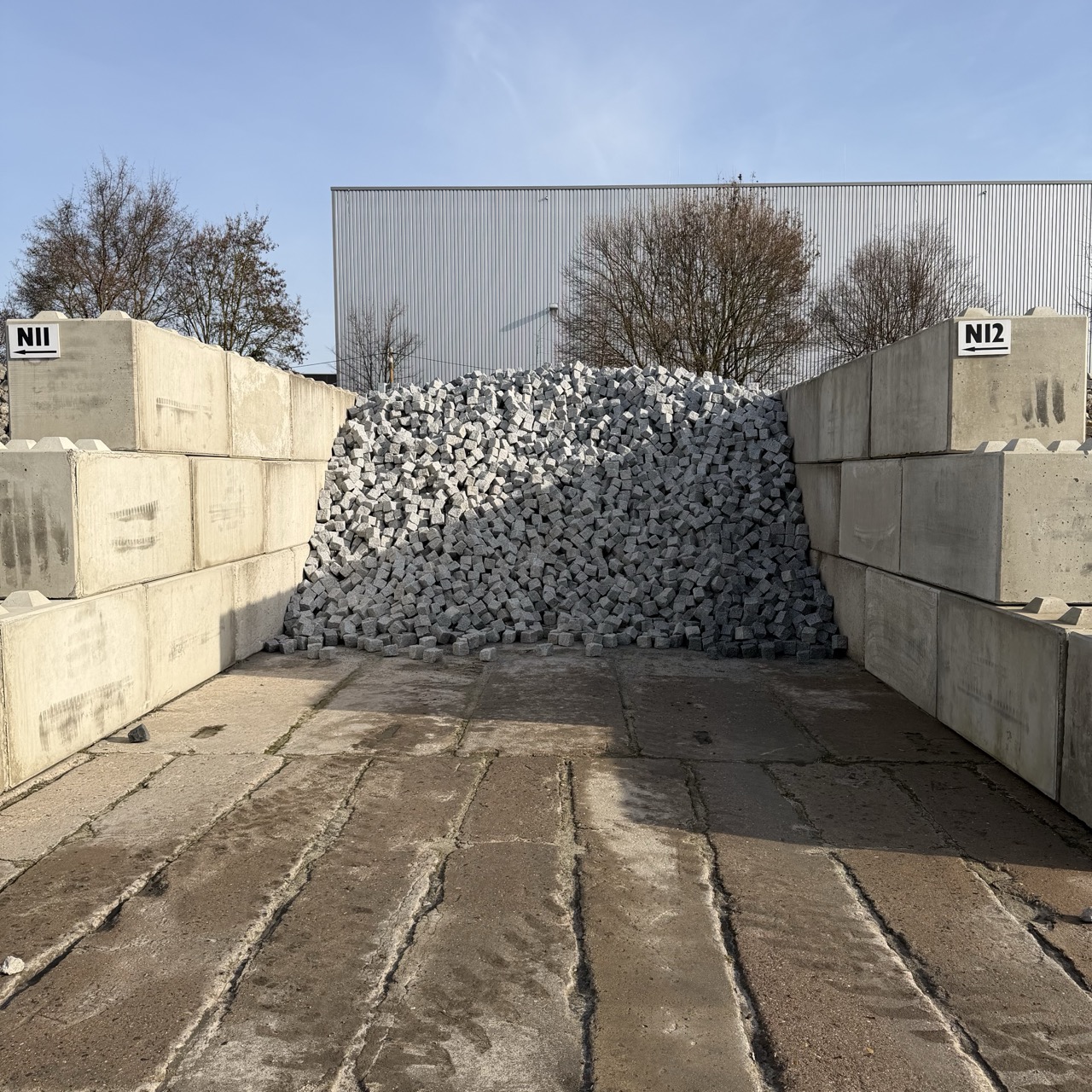 Beim neuen Granit Kleinpflaster aus Box N12 handelt es sich um ein fein- bis mittelkörniges Material, welches deutlich besser als das herkömmliche polnische mittel- bis grobkörnige Pflaster gespalten ist. Dennoch eignet sich das Pflaster eher zur Verlegung in Passe und Bögen. Die Reihenverlegung gestaltet sich schwierig, da die Steine nicht häufig parallele Kanten besitzen.