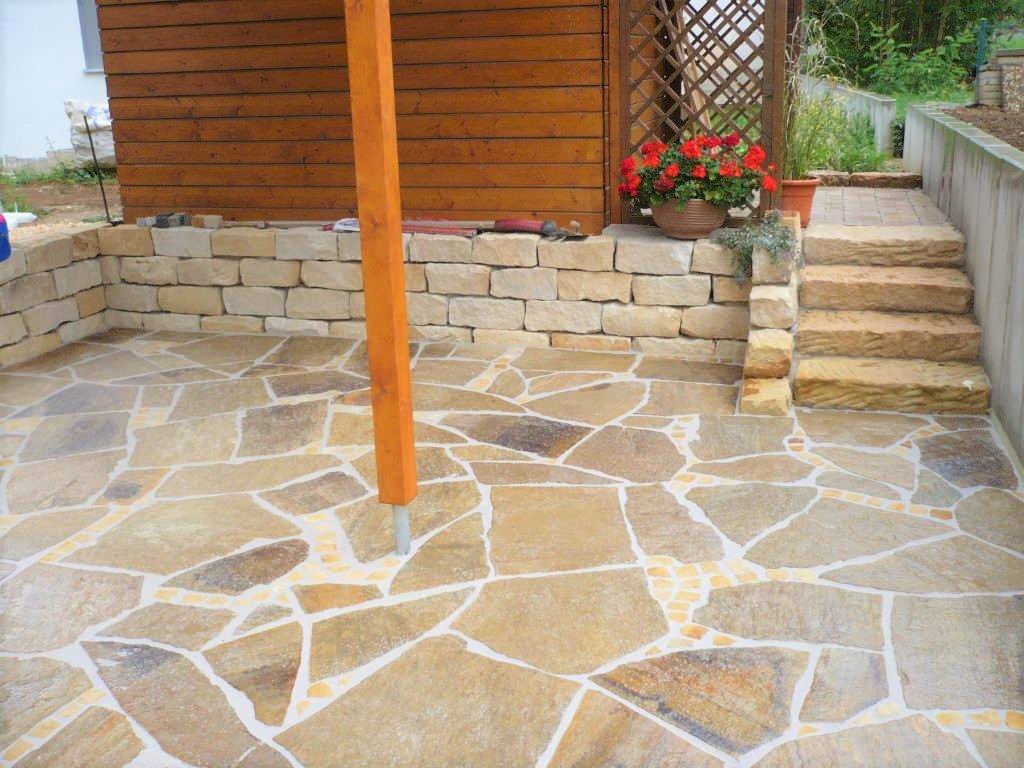 Ebenso wie beim Verlegen von Formatplatten oder Pflastersteinen aus Naturstein können Sie auch Polygonalplatten ungebunden oder gebunden verlegen. Beide Methoden erfordern jedoch zunächst stets das Anlegen eines wetterbeständigen Unterbaus.